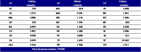 Dentro de las 94 acciones se prevé la creación de 43.000 nuevas plazas carcelarias con la construcción de prisiones especiales destinadas a presos comprendidos en la faja etaria de 18 a 24 años, además de la construcción de penitenciarías femeninas. Esas cárceles tendrán una estructura administrativa diferenciada (salones de clase, salas de informática, espacios productivos, etc.) y operarán con una metodología y un modelo de gestión propios para la población carcelaria joven. Se prevé también la construcción de módulos de educación y de salud, destinados a las unidades que no poseen tales espacios.